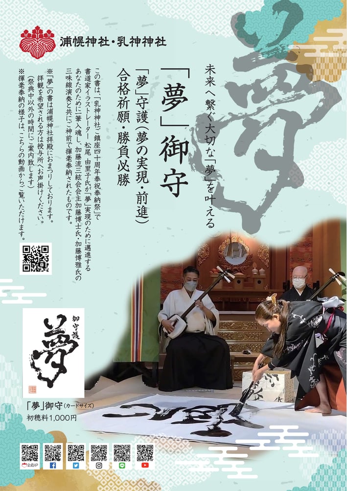 書は、書道家イラストレーター 松尾由里子(まつおゆりこ)氏が「乳神神社ご鎮座40周年奉祝祭」で、一筆入魂し、ご神前で揮毫奉納されたものです。