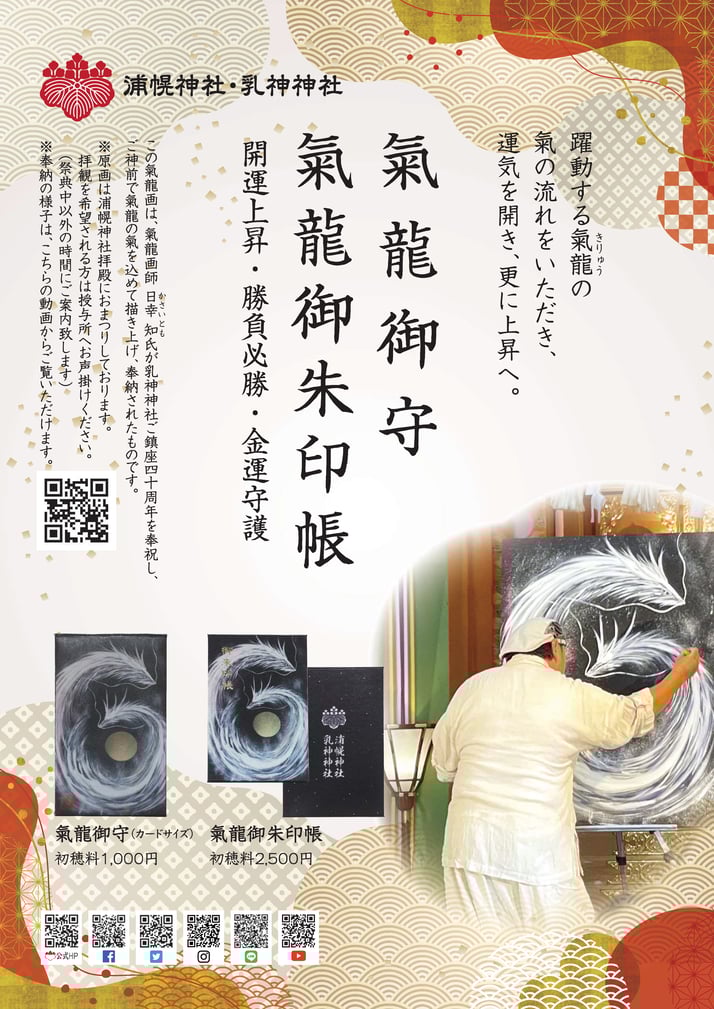 龍の絵は、氣龍画師 日幸知(かさいとも)氏が乳神神社ご鎮座40周年を奉祝し、ご神前で奉納ライブペインティングをされた時の氣龍画です。