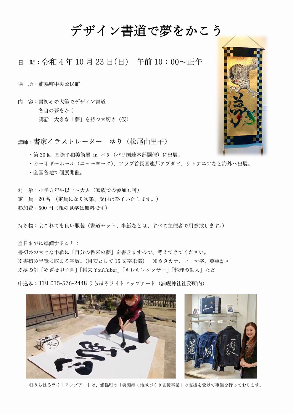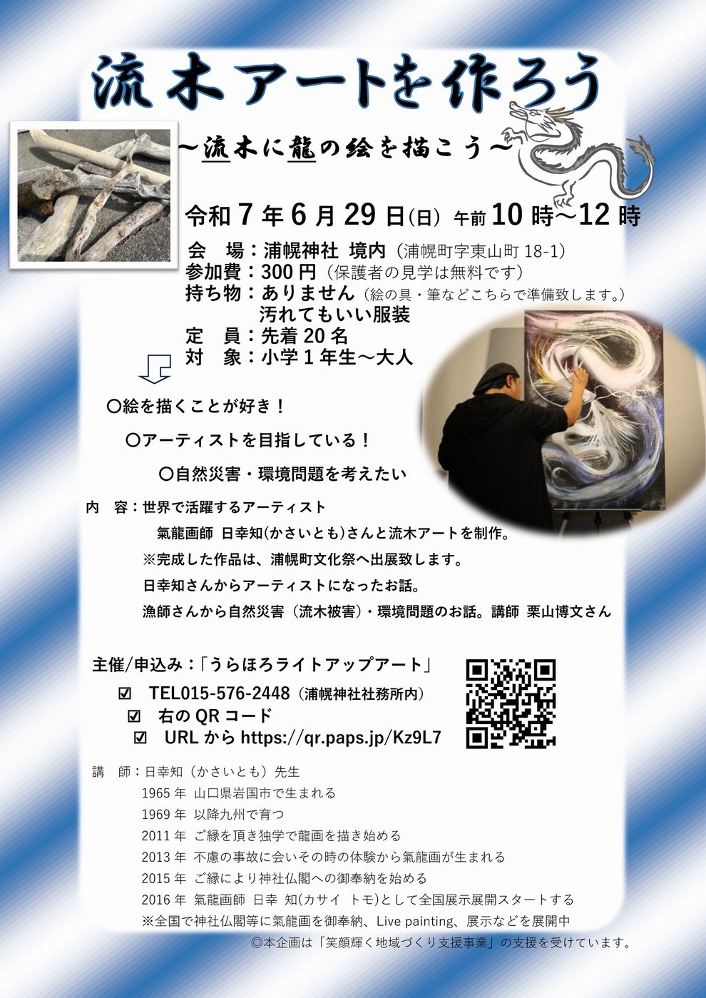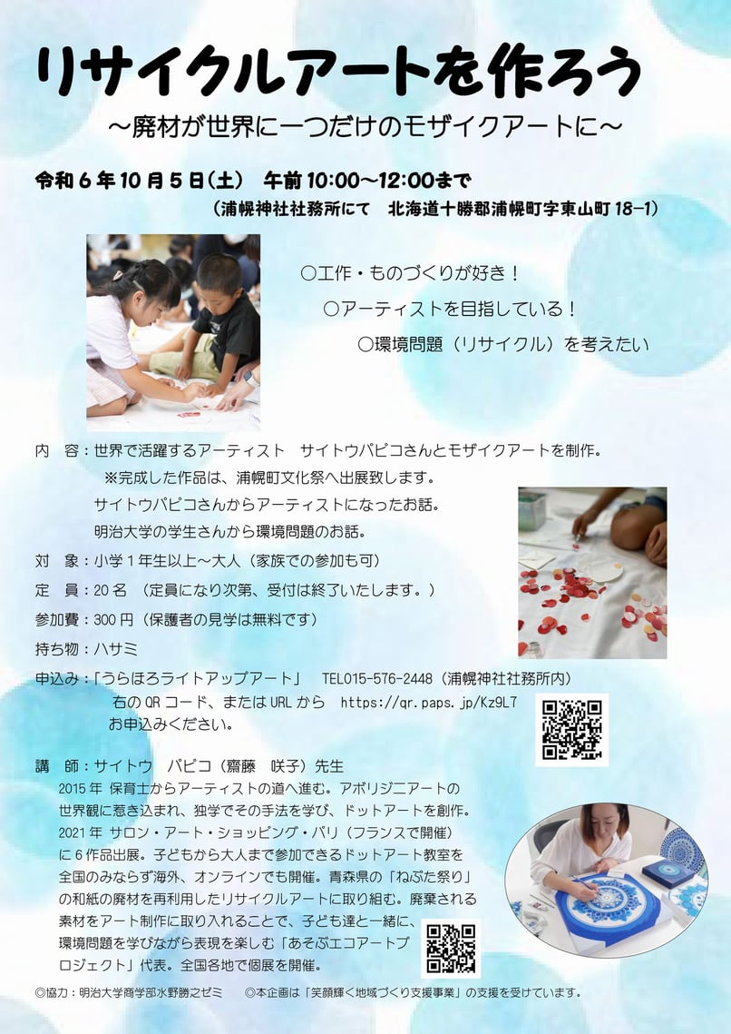 絵画・書道・ものづくり・歌などで世界、日本、十勝で活躍するアーティストさんから直接指導を受けることで、アートを身近に感じてもらい、感性豊かな子どもたちを育む。又、親子で企画に参加してもらい、子どもの芸術面での可能性を見いだし、将来、アーティストになる夢を広げるためのアート体験教室です。