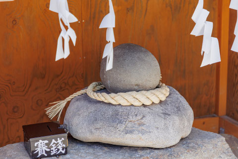 平成22年、翌年に境内社である伏見稲荷神社御鎮座90年の佳節を迎えるに当たり、御社殿ご造営が執り行われました。その折、五代目宮司が真ん丸な石が伏見稲荷神社の横におまつりされている不思議な夢を見たことから、真ん丸を探しに出かけたところ、その日のうちに夢に見た同じ形状の真ん丸な自然石を発見致しました。