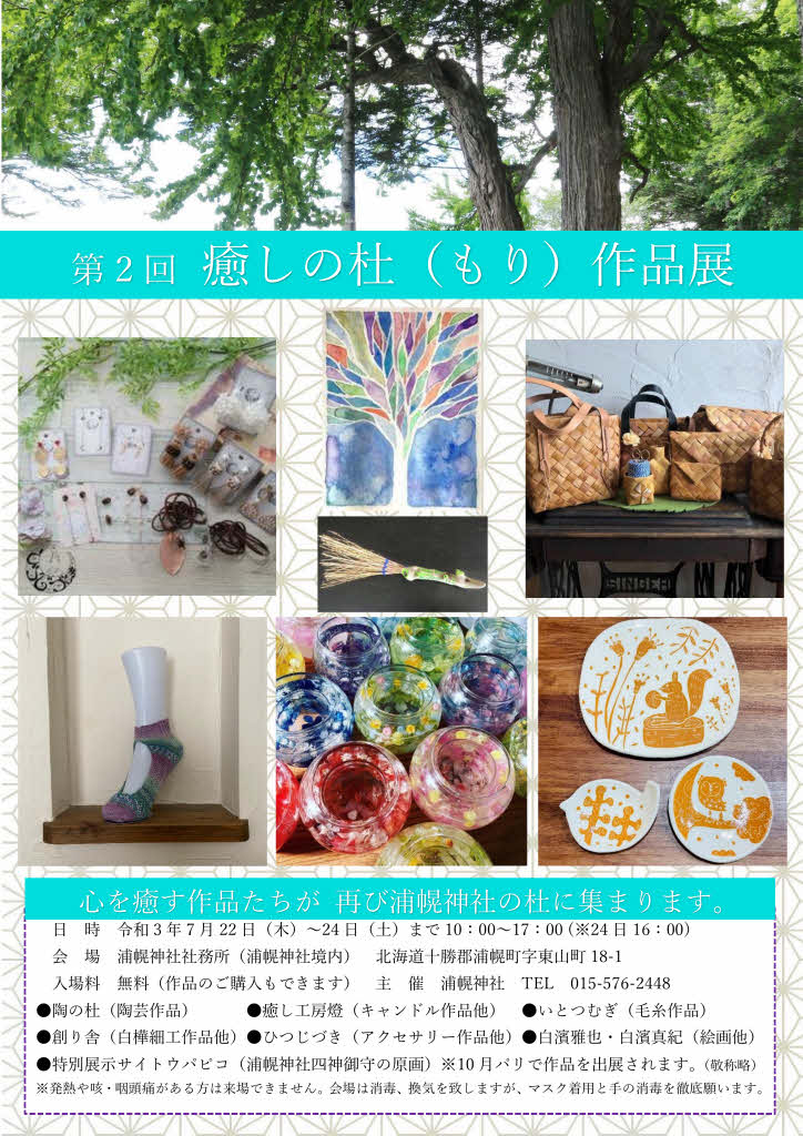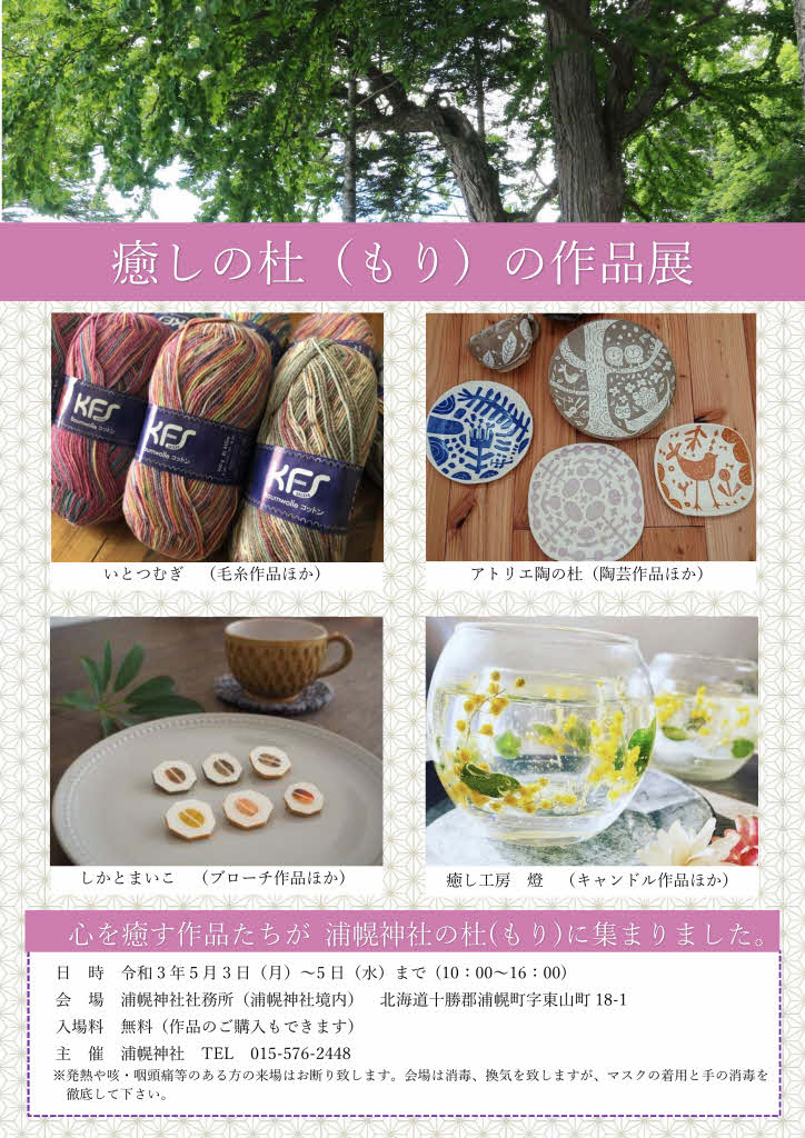 心を癒す作品たちが、 浦幌神社に集まります。 浦幌神社・乳神神社の宮司一筆です。 来る5月3日〜5日、10時〜16時 浦幌神社社務所にて、作品展を開催いたします。 癒やしをコンセプトにした 陶の杜さんの陶芸作品 しかとまいこさんのブローチ作品 癒やし工房燈さんのキャンドル作品 いとつむぎさんの毛糸作品 を展示いたします。...