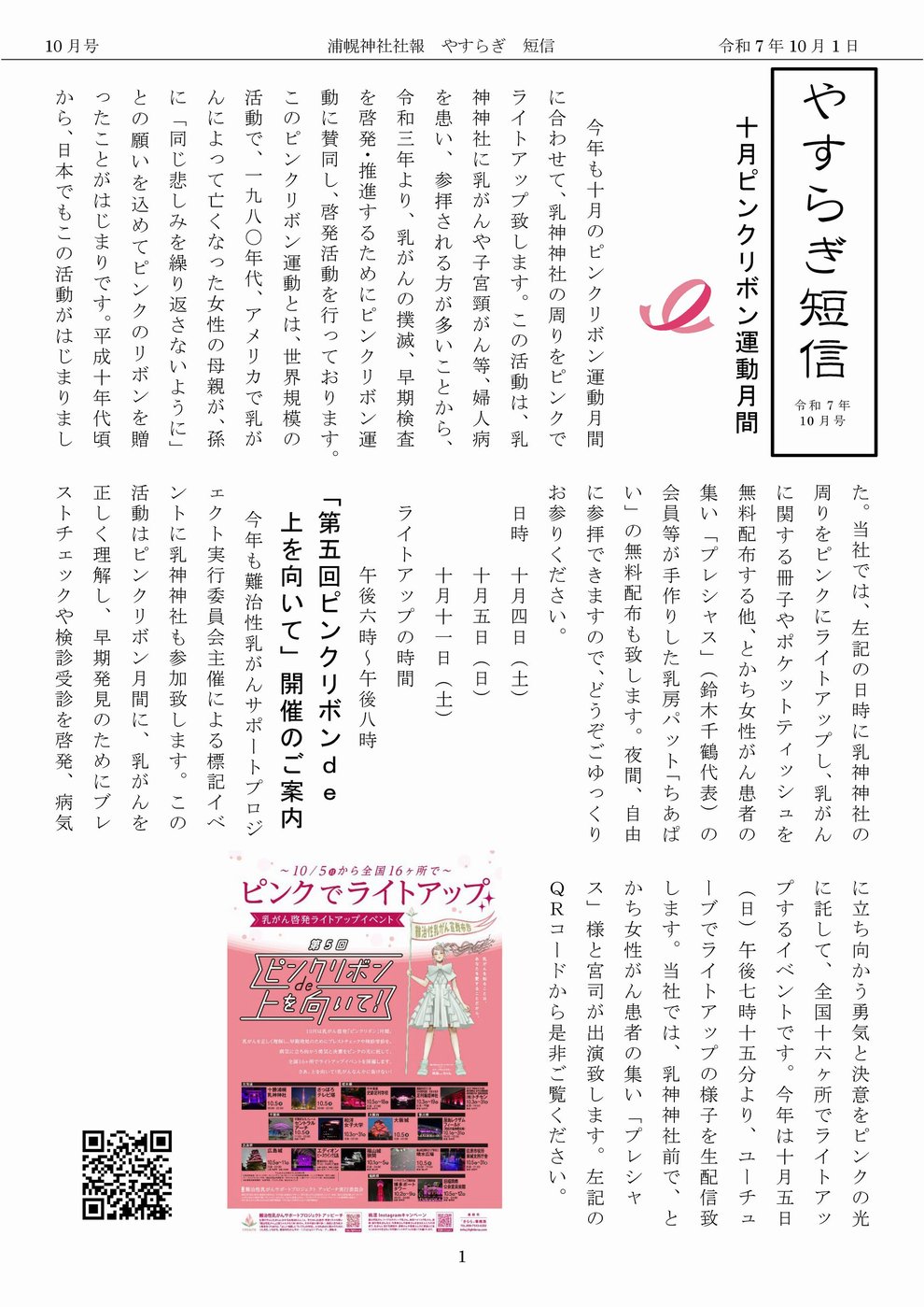 浦幌神社「やすらぎ短信」令和7年10月号を10月1日に発行致しました。 どうぞ、ご覧下さい。