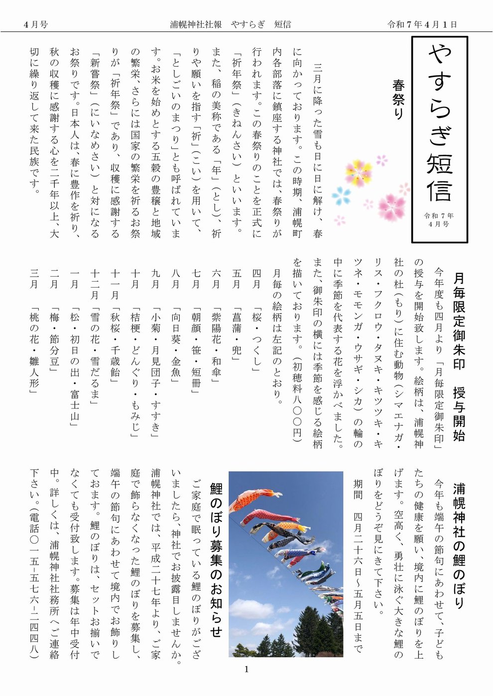 浦幌神社「やすらぎ短信」令和7年4月号を4月1日に発行致しました。 どうぞ、ご覧下さい。