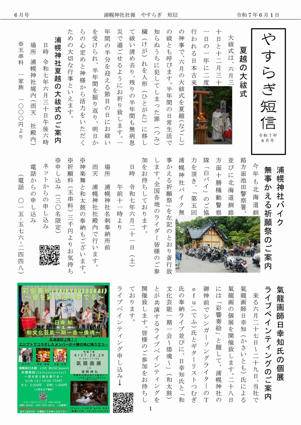 浦幌神社「やすらぎ短信」令和7年6月号を6月1日に発行致しました。 どうぞ、ご覧下さい。