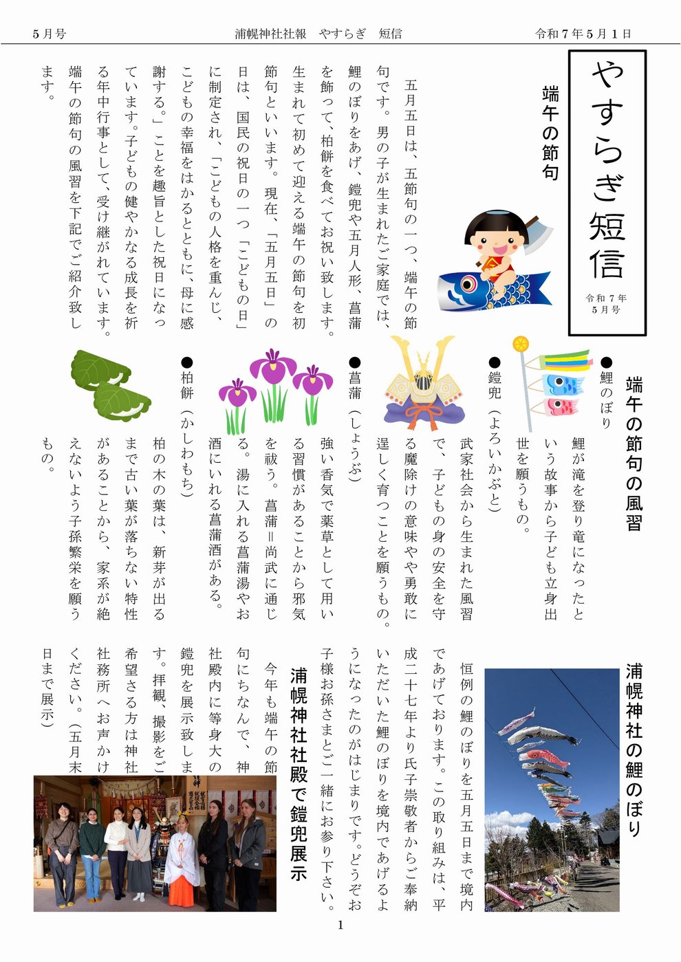 浦幌神社「やすらぎ短信」令和7年5月号を5月1日に発行致しました。 どうぞ、ご覧下さい。