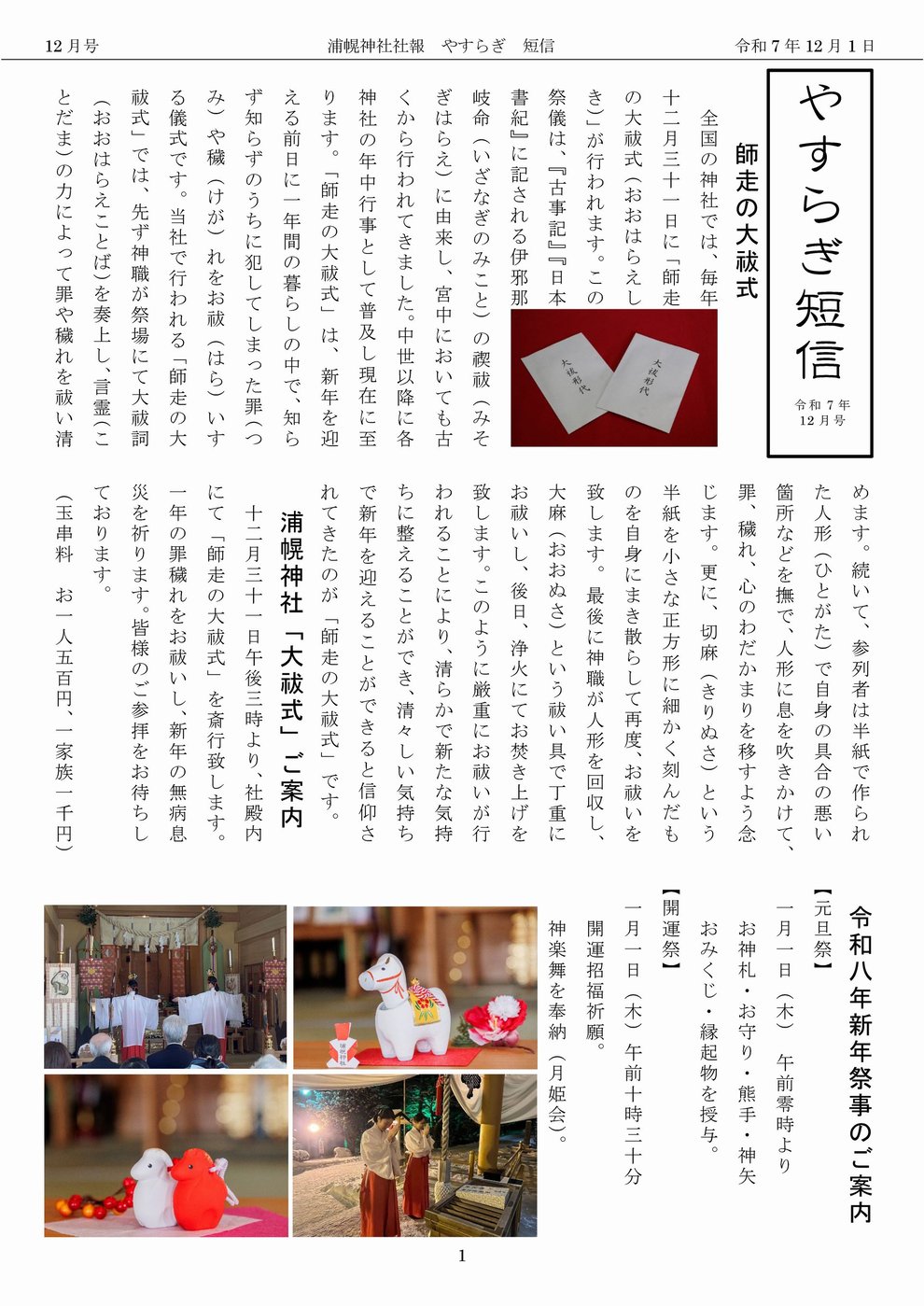 浦幌神社「やすらぎ短信」令和7年12月号を12月1日に発行致しました。 どうぞ、ご覧下さい。