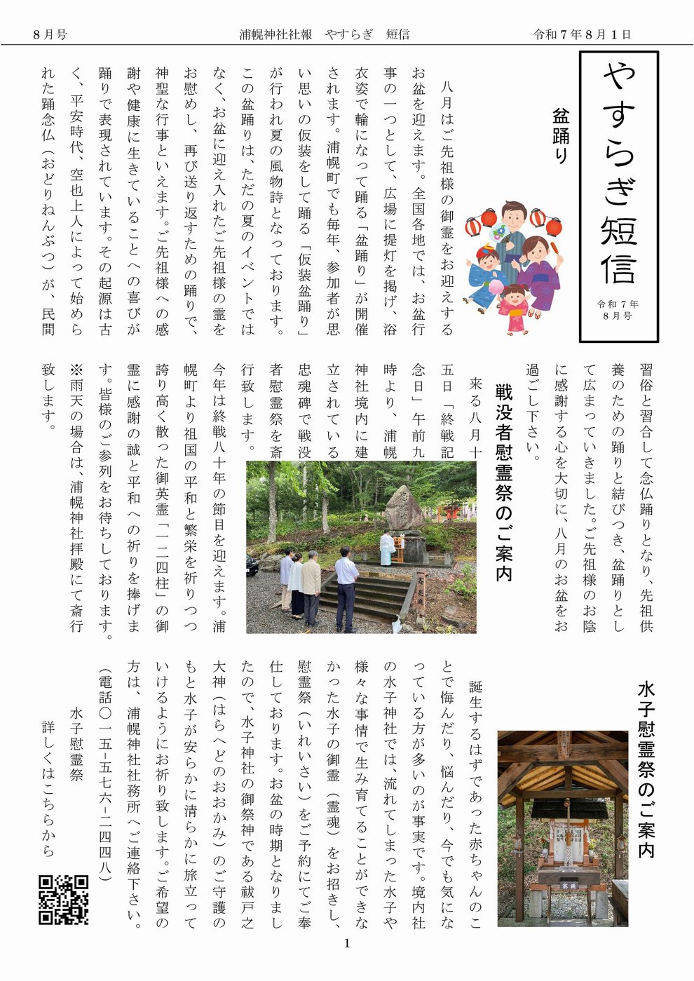 浦幌神社「やすらぎ短信」令和7年8月号を8月1日に発行致しました。 どうぞ、ご覧下さい。