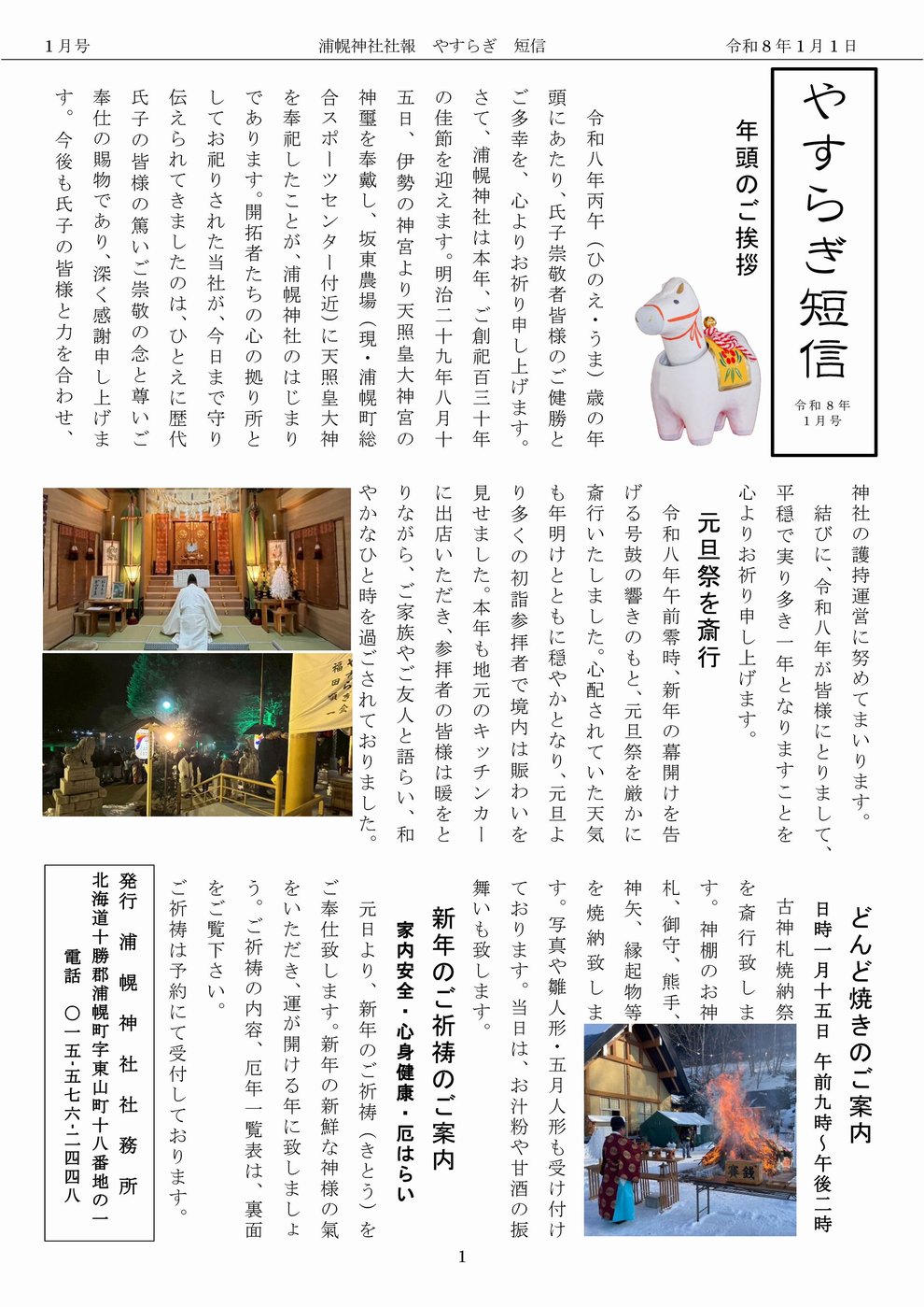 浦幌神社「やすらぎ短信」令和8年1月号を1月1日に発行致しました。 どうぞ、ご覧下さい。