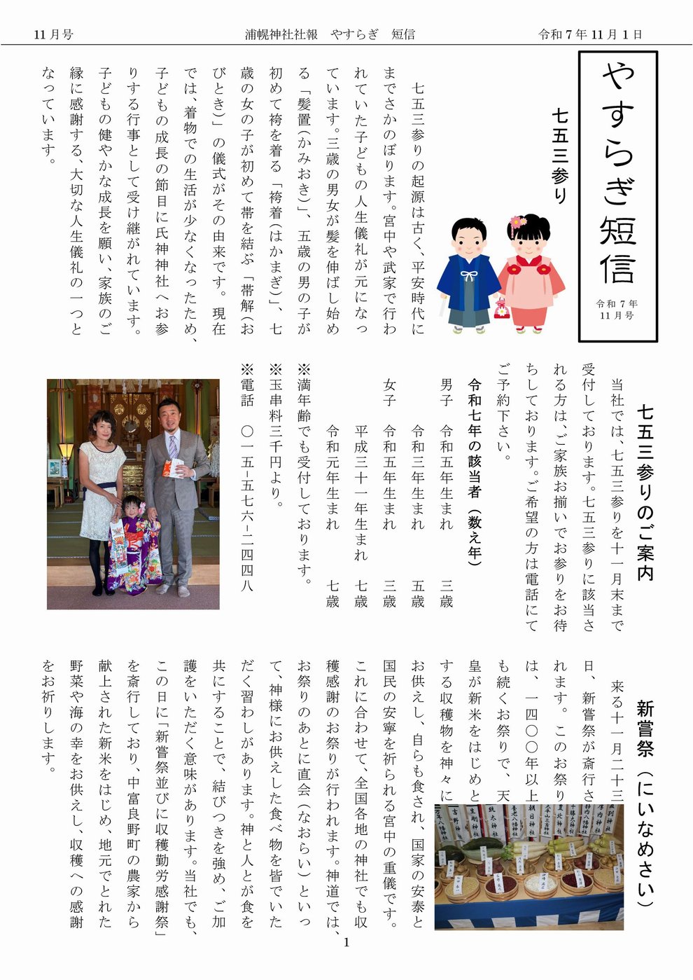 浦幌神社「やすらぎ短信」令和7年11月号を11月1日に発行致しました。 どうぞ、ご覧下さい。