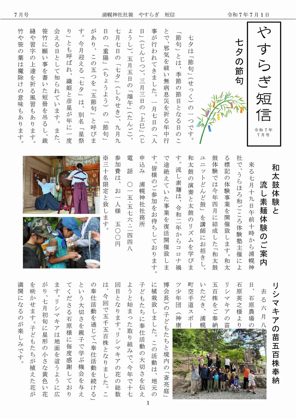 浦幌神社「やすらぎ短信」令和7年7月号を7月1日に発行致しました。 どうぞ、ご覧下さい。