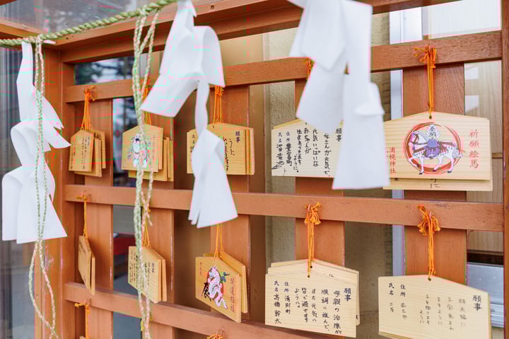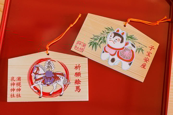 各自の願い事を書いて祈願し、賽銭箱右横の「絵馬奉納所」へご奉納下さい。