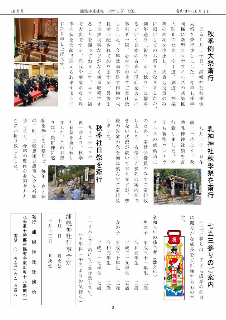 やすらぎ短信 · 10月 01日, 2021年 浦幌神社「やすらぎ短信」令和3年10月号発行 浦幌神社「やすらぎ短信」令和3年10月号を10月1日に発行致しました。 どうぞ、ご覧下さい。 浦幌神社「やすらぎ短信」令和3年10月号 令和3年10月号.pdf PDFファイル 530.4 KB ダウンロード tagPlaceholderカテゴリ: