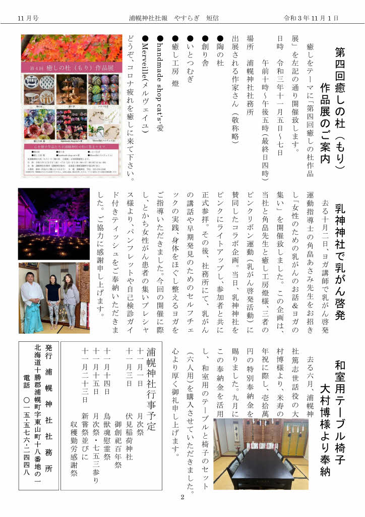 やすらぎ短信 · 11月 01日, 2021年 浦幌神社「やすらぎ短信」令和3年11月号発行 浦幌神社「やすらぎ短信」令和3年11月号発行を11月1日に発行致しました。 どうぞ、ご覧下さい。 浦幌神社「やすらぎ短信」令和3年11月号 令和3年11月号.pdf PDFファイル 485.7 KB ダウンロード tagPlaceholderカテゴリ:
