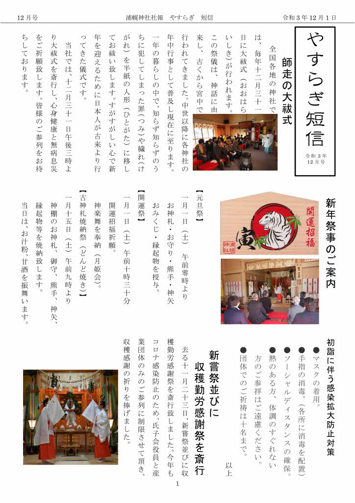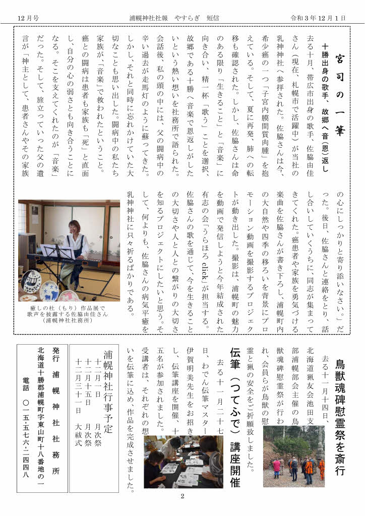 やすらぎ短信 · 12月 01日, 2021年 浦幌神社「やすらぎ短信」令和3年12月号発行 浦幌神社「やすらぎ短信」令和3年12月号を12月1日に発行致しました。 どうぞ、ご覧下さい。 浦幌神社「やすらぎ短信」令和3年12月号 令和3年12月号.pdf PDFファイル 516.4 KB ダウンロード tagPlaceholderカテゴリ:
