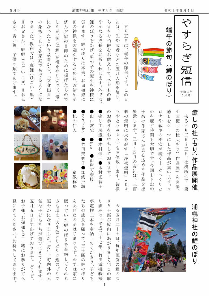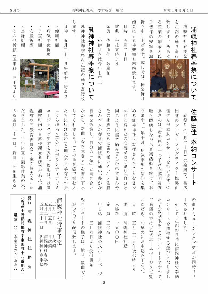 やすらぎ短信 · 5月 01日, 2022年 浦幌神社「やすらぎ短信」令和4年5月号発行 浦幌神社「やすらぎ短信」令和4年5月号を5月1日に発行致しました。 どうぞ、ご覧下さい。 浦幌神社「やすらぎ短信」令和4年5月号 令和4年5月号.pdf PDFファイル 462.0 KB ダウンロード tagPlaceholderカテゴリ:
