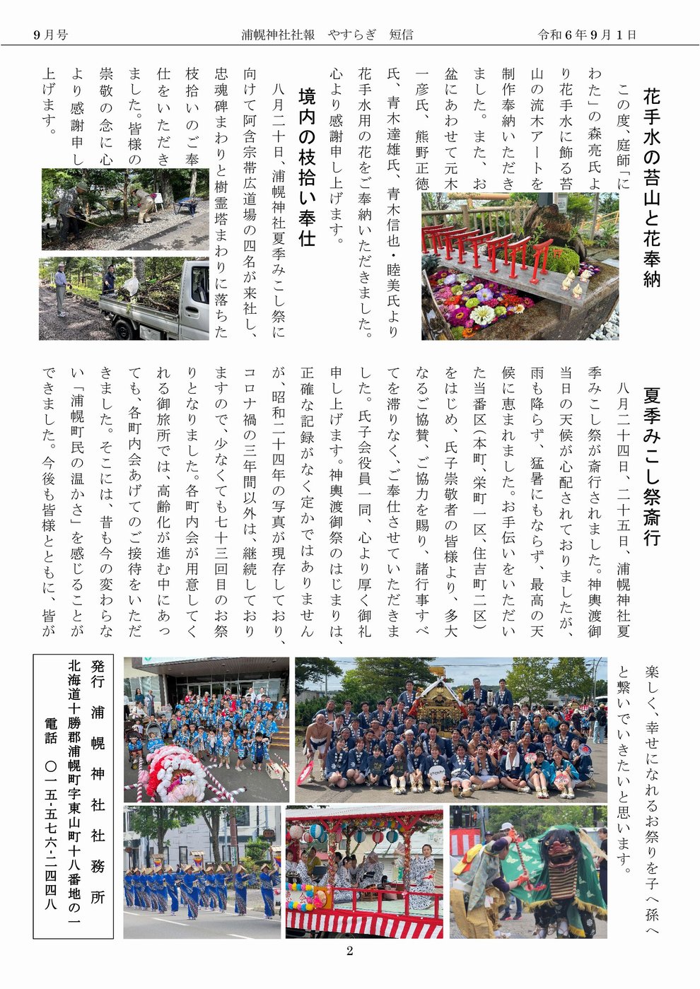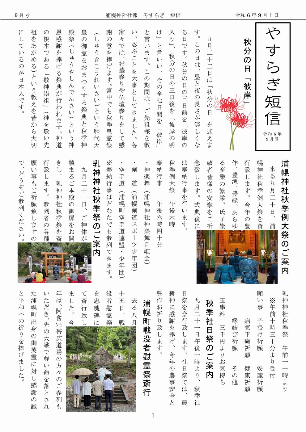 やすらぎ短信 · 9月 01日, 2024年 浦幌神社「やすらぎ短信」令和6年9月号発行 浦幌神社「やすらぎ短信」令和6年9月号を9月1日に発行致しました。 どうぞ、ご覧下さい。 浦幌神社「やすらぎ短信」令和6年9月号 令和6年9月号.pdf PDFファイル 1.2 MB ダウンロード tagPlaceholderカテゴリ: コメントをお書きください コメント: 0