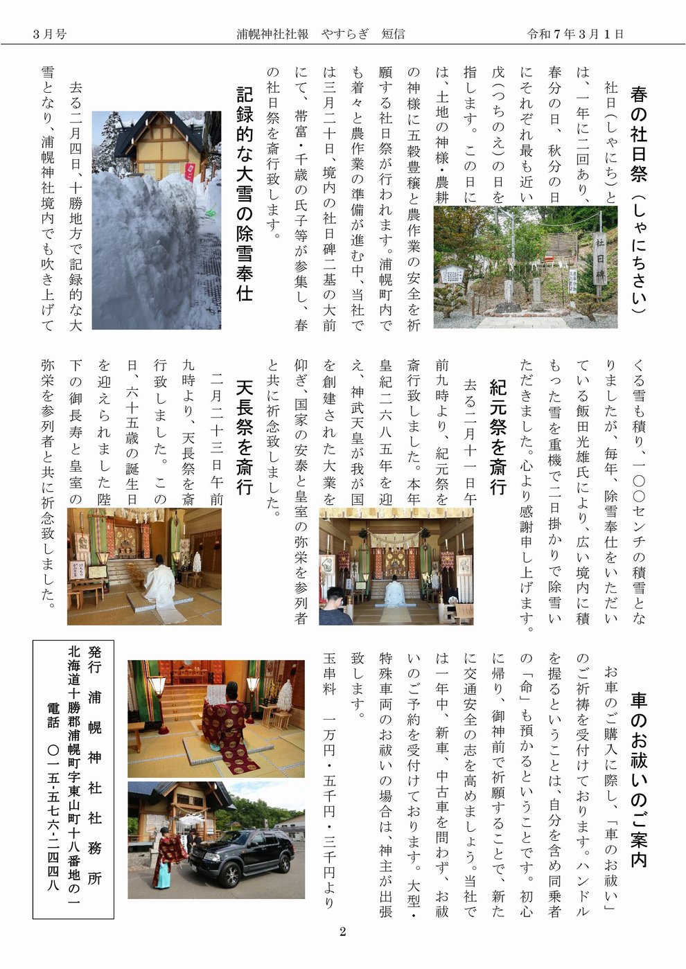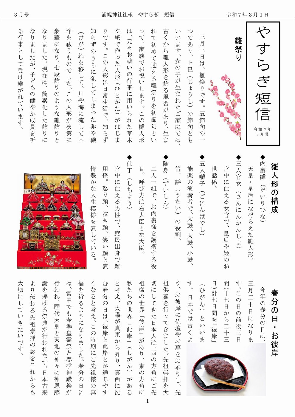 やすらぎ短信 · 3月 01日, 2025年 浦幌神社「やすらぎ短信」令和7年3月号発行 浦幌神社「やすらぎ短信」令和7年3月号を3月1日に発行致しました。 どうぞ、ご覧下さい。 浦幌神社「やすらぎ短信」令和7年3月号 令和7年3月号.pdf PDFファイル 745.3 KB ダウンロード tagPlaceholderカテゴリ: コメントをお書きください コメント: 0